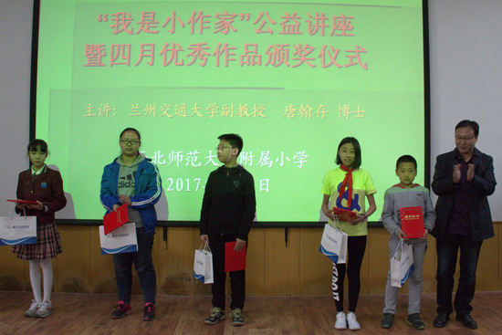 5月5日下午,由兰州市委宣传部、兰州市文明办、兰州日报社、兰州市教育局、兰州市文联联合主办,兰州晚报承办的首届惠正杯“我是小作家”公益讲堂暨兰州市中小学生作文大赛第四期月赛优胜奖颁奖仪式在我校附属小学举行。