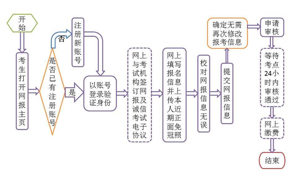 网上报名及其后续工作主要包括:考生网上填报、考点网上审核、考生网上缴费、考生上网打印准考证几个环节。