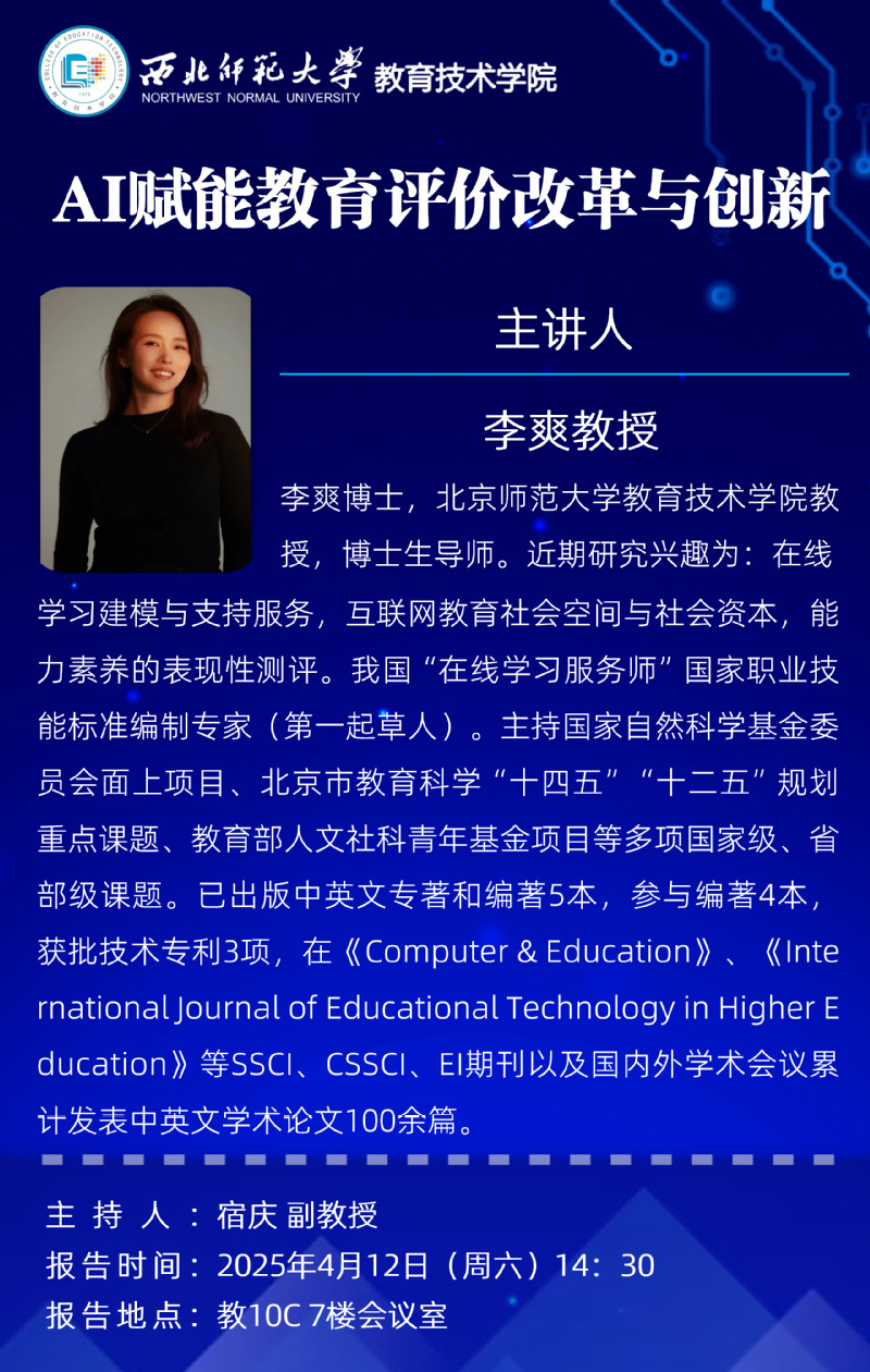 李爽,博士,北京师范大学教育技术学院教授、博士生导师。主要从事在线学习建模与支持服务,互联网教育社会空间与社会资本,能力素养的表现性测评等研究,是我国“在线学习服务师”国家职业技能标准编制专家(第一起草人)。主持国家自然科学基金面上项目、北京市教育科学“十四五”“十二五”规划重点课题、教育部人文社科青年基金项目等科研项目多项;出版中英文专著和编著5部,参与编著4部;获批技术专利3项;在Computer & Education、International Journal of Educational Technology in Higher Education等SSCI、CSSCI、EI收录期刊及国内外学术会议发表学术论文100余篇。